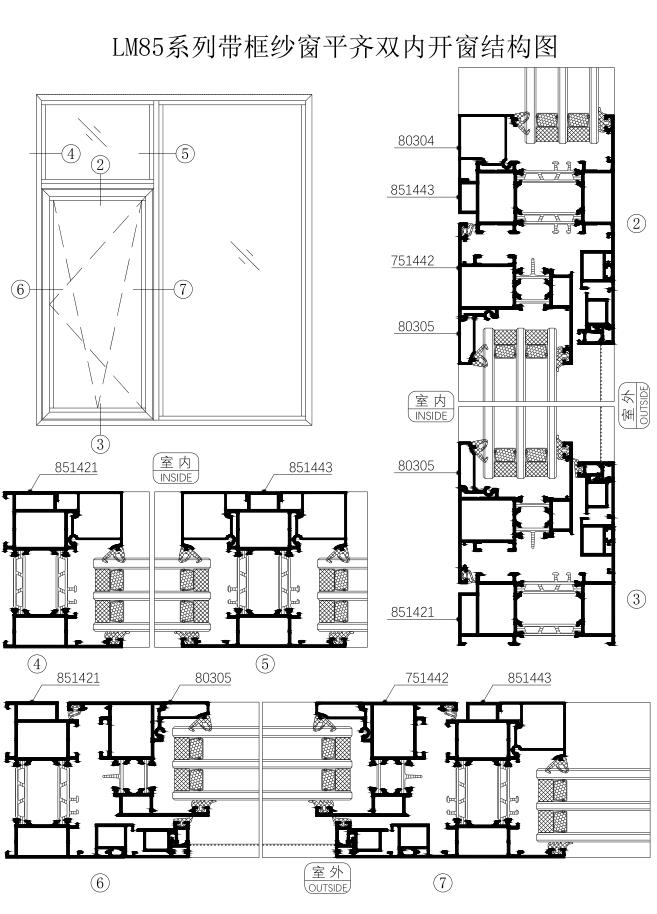 LM85系列帶框紗窗平齊雙內開窗結構圖